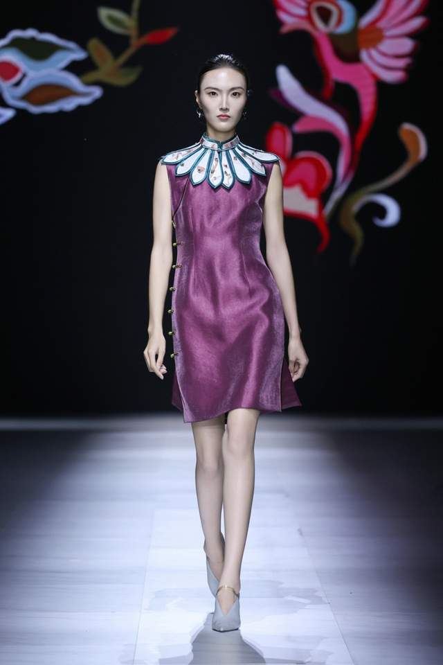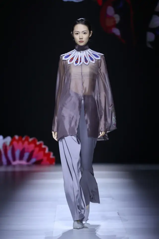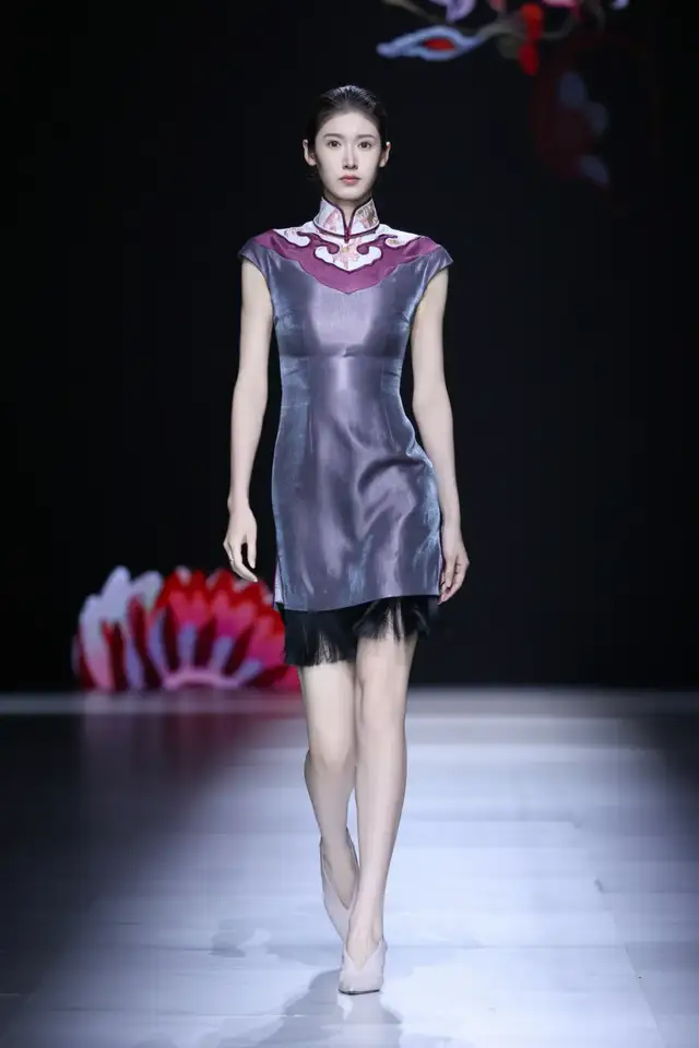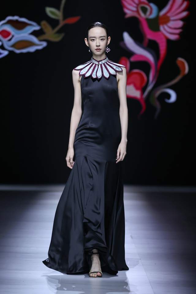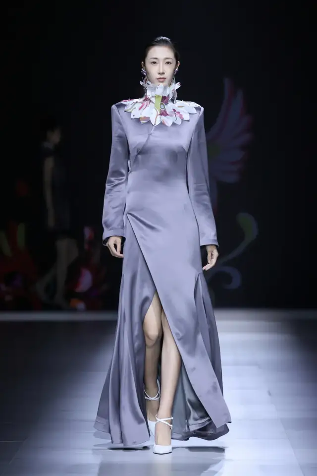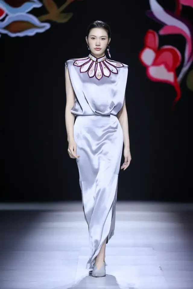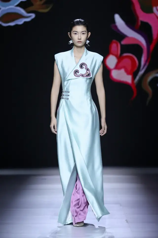 设计风格以清代传统服装装饰织物“云肩”为灵感出发,融合了中式的旗袍特点与西式的基础廓形,演绎时尚摩登东方新意境。