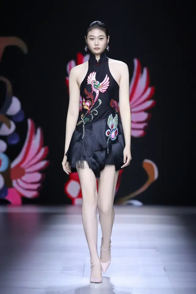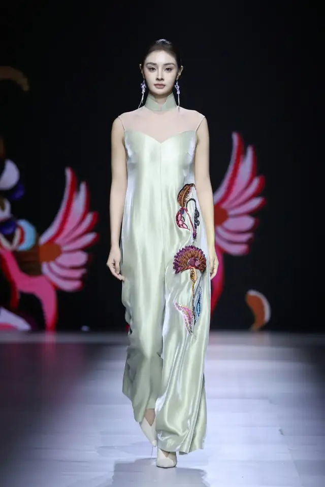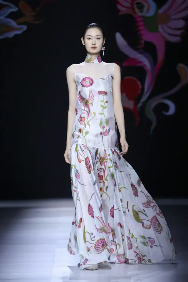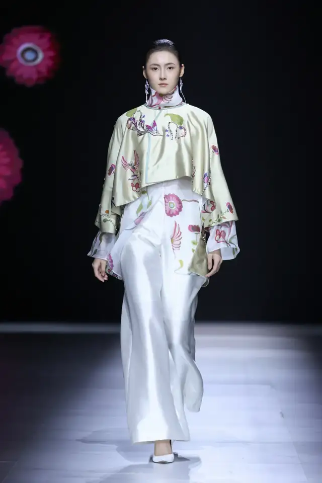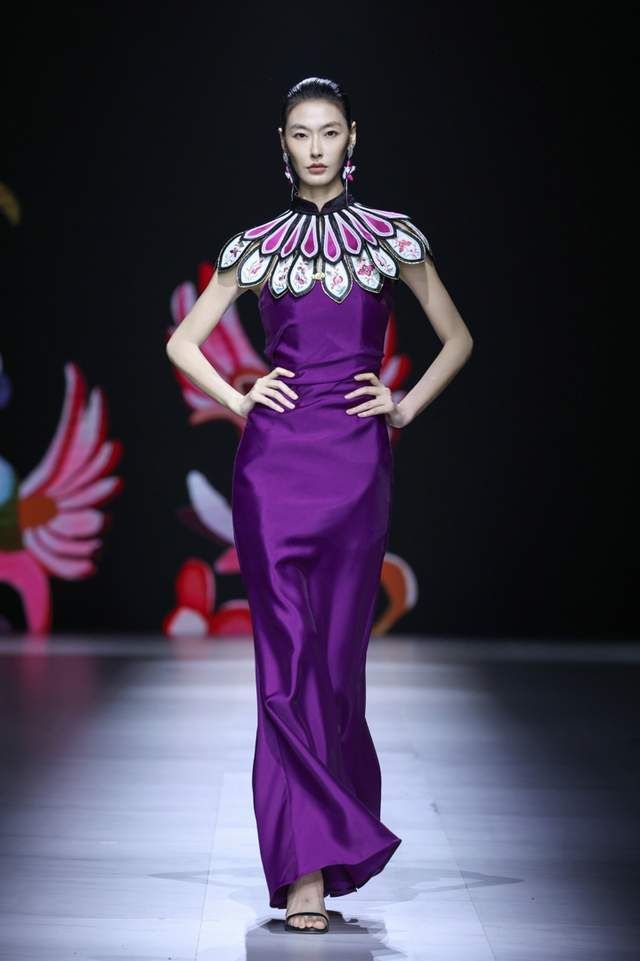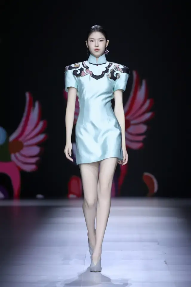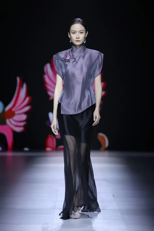 设计风格以清代传统服装装饰织物“云肩”为灵感出发,融合了中式的旗袍特点与西式的基础廓形,演绎时尚摩登东方新意境。