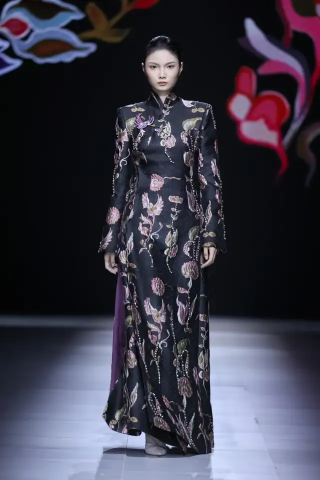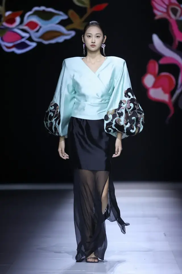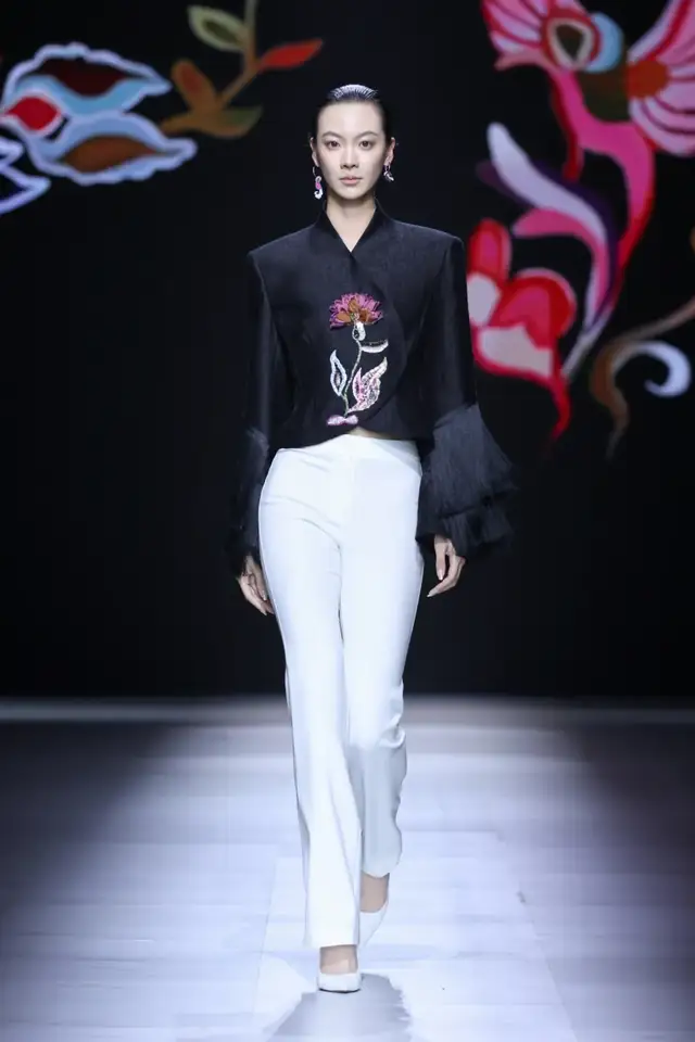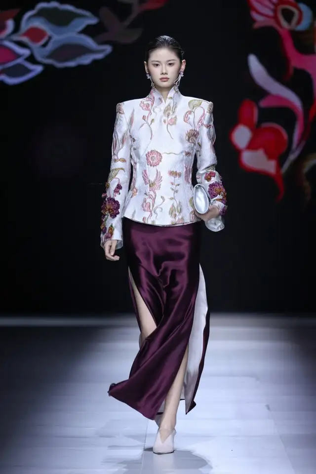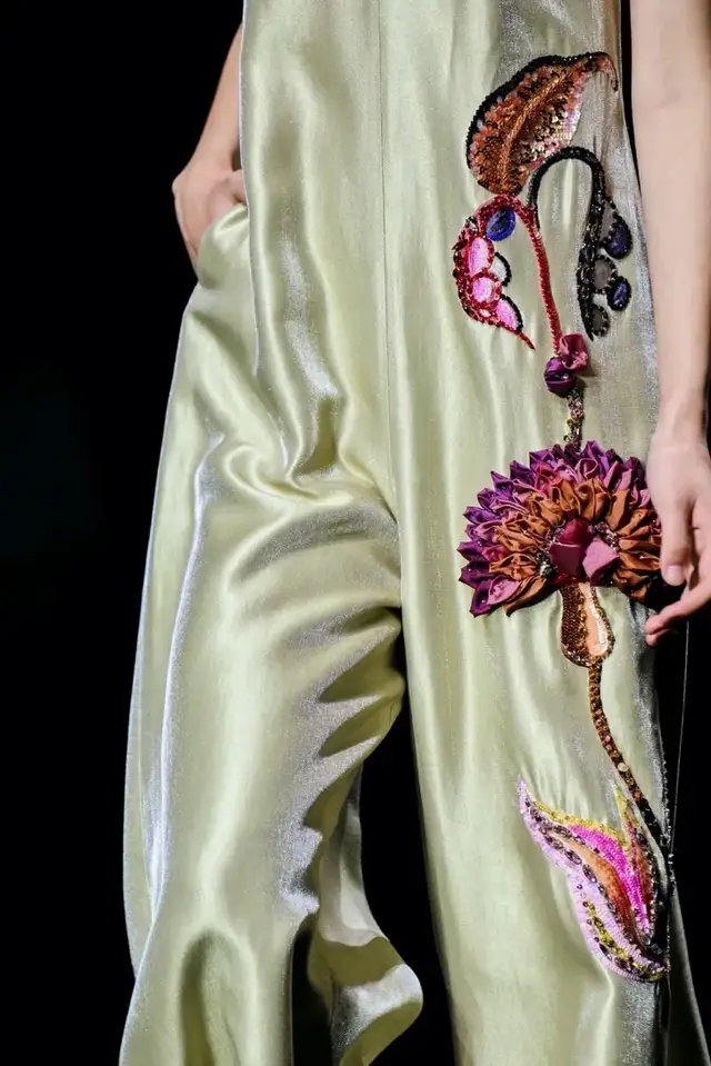 当传统服饰技艺遇上现代时装语境,“镶、嵌、滚、宕、绣、绘、镂、盘” 八大经典工艺不再是博物馆里的静态符号,而是被匠心活化于衣身的灵动语言,每一处细节都在诉说古典技法的当代新生。