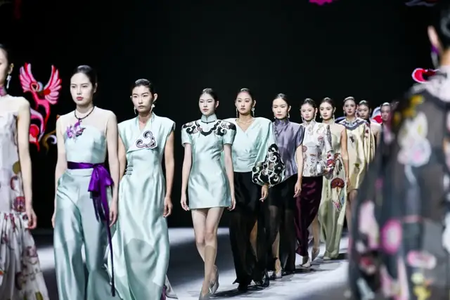 细腻的 “镶” 与 “嵌”,让面料边缘与纹样衔接处多了层温润过渡,或撞色镶边勾勒轮廓,或精巧嵌花暗藏巧思;利落的 “滚” 与 “宕”,以宽窄不一的滚条、宕线沿着衣缝、领口游走,为简约剪裁注入古典的利落质感;而 “绣” 与 “绘” 则是工艺的 “笔墨”—— 绣线以疏密韵律织就纹样,针脚里藏着手工的温度;彩绘则以轻盈笔触晕染色彩,让图案多了层写意的朦胧;更有 “镂” 的通透与 “盘” 的立体,镂空处见光影流转,盘扣则以盘旋的弧度锁住东方雅致,既是扣合功能,亦是衣身的视觉焦点。
