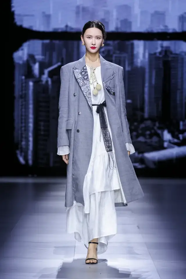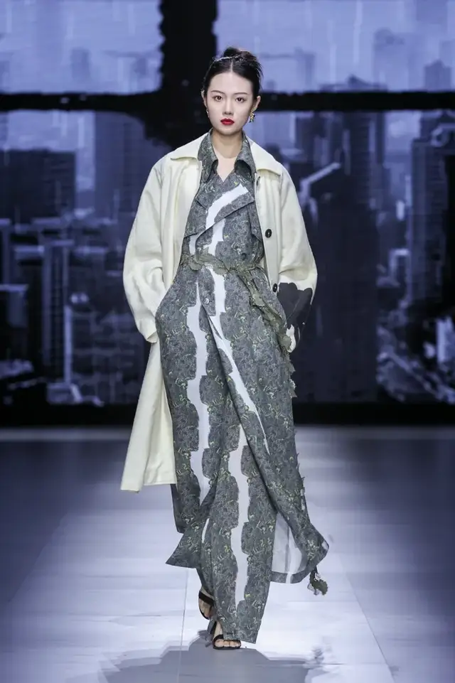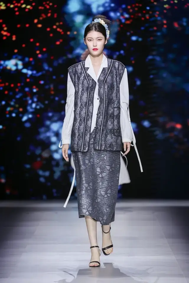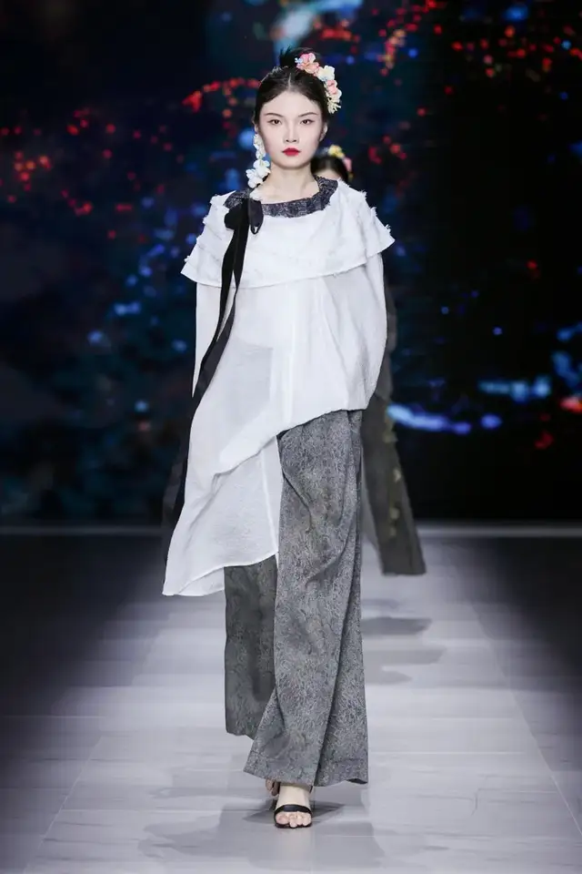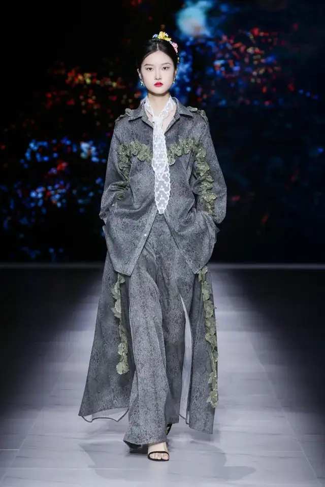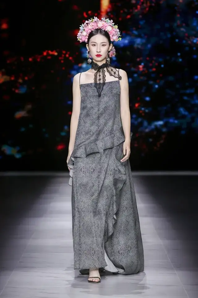 此次发布主题繁花,灵感来自福建泉州非遗簪花,当地“以簪花为美”的世代风俗,将这项非遗技艺的理念和文化元素延伸到当代时装,面料采用提花工艺,以及不同花型的提花织造来表现,并加入印花、绣花、剪花等工艺,色彩以黑白基调为主,穿插印花图案的面料和工艺,使整个系列古典又不失潮流时尚之感。