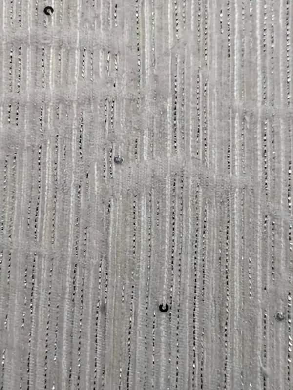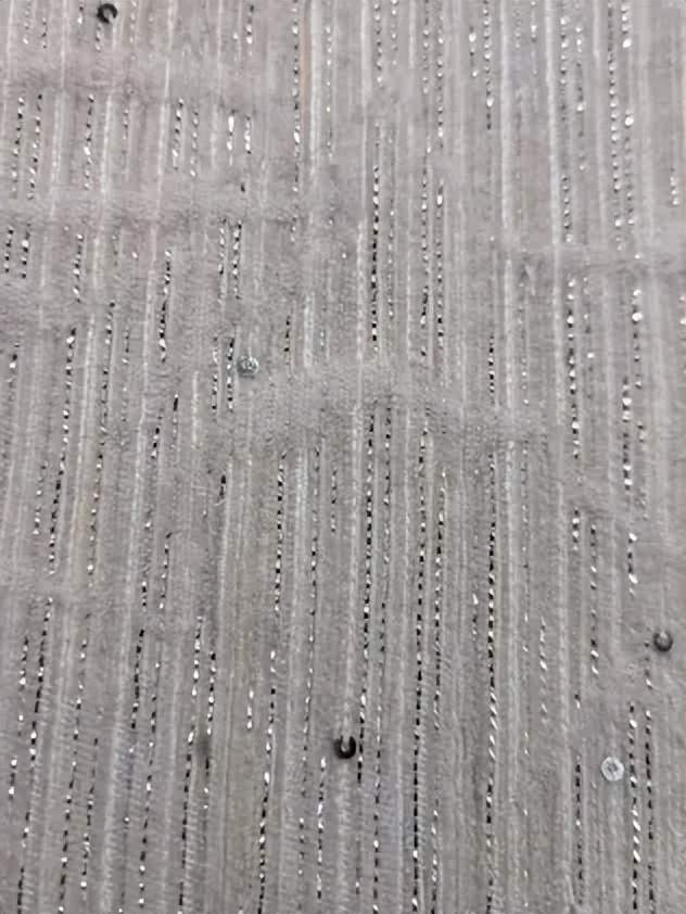 采用提花重工艺为核心设计亮点,不仅突破设备限制,实现差异化珠片纱在提花机上的精准织造,让珠片元素与提花纹理自然融合;更以雪尼尔的软糯肌理搭配金银丝的璀璨光泽,双重材质碰撞下,既让面料的肌理层次更显丰盈立体,又为其注入鲜明的时尚感,打破传统面料的单调感。凭借这份兼具工艺质感与风格表现力的特质,该面料尤其适配男女套装、西装等时装品类,能为正装服饰注入灵动细节,在保持版型挺括的同时,平衡正式感与潮流属性,成为提升时装精致度的优质之选。