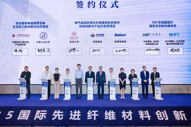 活动还举行了行业知名纤维创新主体与下游企业成果转化签约仪式,喷气涡流纺再生纤维高效纺纱技术协同创新与产业化攻坚项目、人工智能大模型技术深度赋能功能性面料加工项目等11个先进纤维材料成果转化项目签约,多方携手加快推动项目落地,深化后续协同,将先进纤维创新成果早日转化为实实在在的产业竞争力。活动发布了十大类纺织创新产品“持续创新单位”,江苏华佳丝绸股份有限公司、苏州龙泉禧里丝绸科技有限公司等盛泽企业榜上有名。