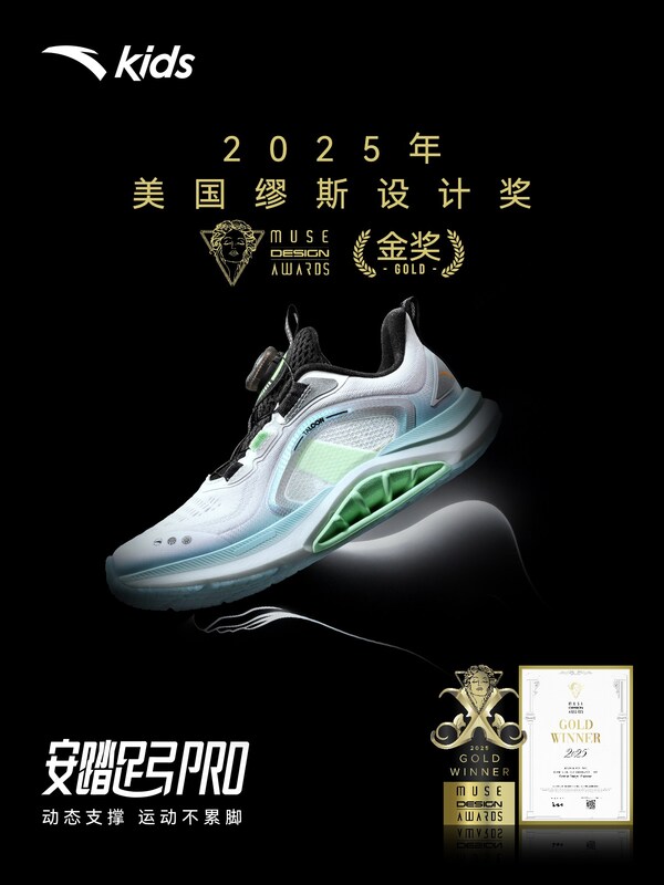 厦门2025年10月20日 /美通社/ — 安踏儿童旗下产品”足弓PRO跑鞋”凭借对儿童足弓健康成长的深刻洞察与科学的产品设计,荣获2025年缪斯设计奖(MUSE Design Awards)金奖。该奖项作为国际设计领域的权威奖项之一,被誉为全球设计领域的风向标,旨在表彰具有创新性的卓越设计。此次获奖,标志着中国品牌在儿童健康科技产品领域的设计实力获得了国际认可,也体现了中国品牌以科技创新助力儿童健康公共健康议题解决的不懈努力。