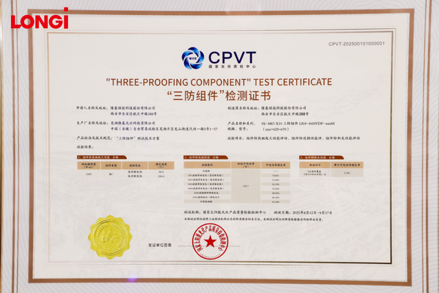 作为隆基分布式战略的核心产品——Hi-MO X10三防组件的性能优势直击工商业痛点。其基于全球领先的HPBC 2.0电池技术打造,组件量产效率达24.8%,最高功率670W,较行业主流产品高出30W以上。在硕晴纺织的屋顶上,5000平方米空间实现1MW装机,正是得益于其“更多发电、更多安装”的特性,较常规组件提升5%以上装机容量。Hi-MO X10三防组件以其优异的“防起火、防遮挡、防积灰”性能,荣获国家光伏质检中心颁发的“三方组件”检测证书。