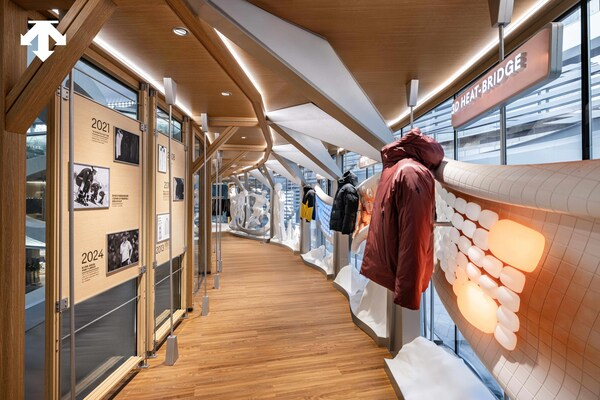 连接”专精之域”与下一主题空间的连廊,集中了品牌多年来的技术积累。中部设置莫比乌斯环装置,其上呈现滑雪、铁人三项、高尔夫与跑步等多项运动形象,直观展示品牌在三大专业运动及多场景训练领域的体系化布局。连廊一侧展示 HEAT NAVI®、3D 保温系统、SCHEMATECH 等核心服装科技,另一侧则呈现品牌发展过程中的重要里程碑节点。通过材料、结构与图文信息的组合呈现,品牌多年在功能创新与产品研发层面的积累得以清晰展示。