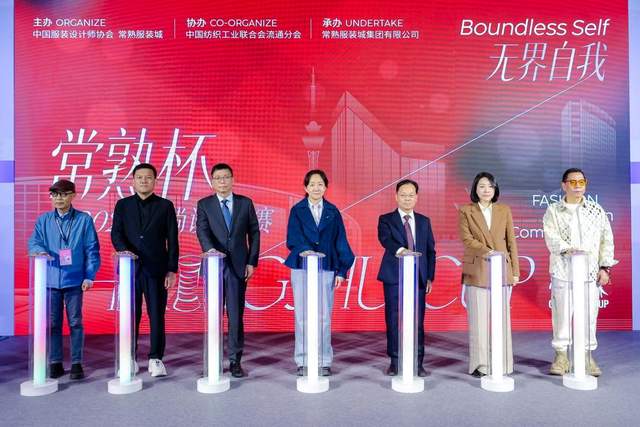 随后,新闻发布会迎来重要环节——启动仪式。在热烈的掌声中,中国服装设计师协会专职副主席朱少芳、谢方明、秘书长王莹、中国纺织工业联合会流通分会副会长王水元、常熟服装城集团有限公司党委书记、董事长夏明宝,中国服装设计师协会副主席、武汉纺织大学外经贸学院艺术设计学部书记、主任熊兆飞,中国服装设计师协会副主席,华南师范大学创意设计学院学科带头人吴洪七位嘉宾共同登台,倒计时声中,2026常熟杯时尚设计大赛正式拉开帷幕,本届大赛的主题与主视觉也同步揭晓。