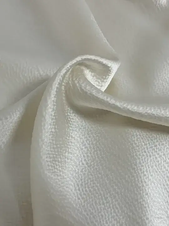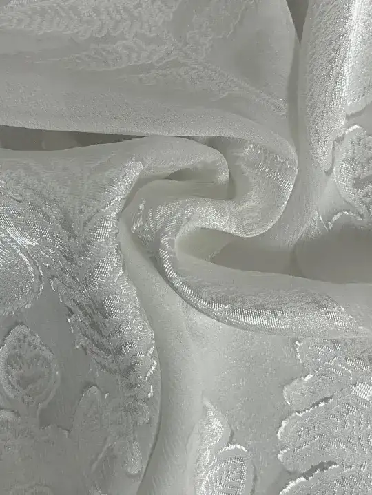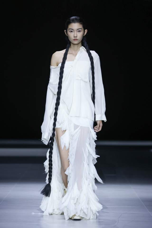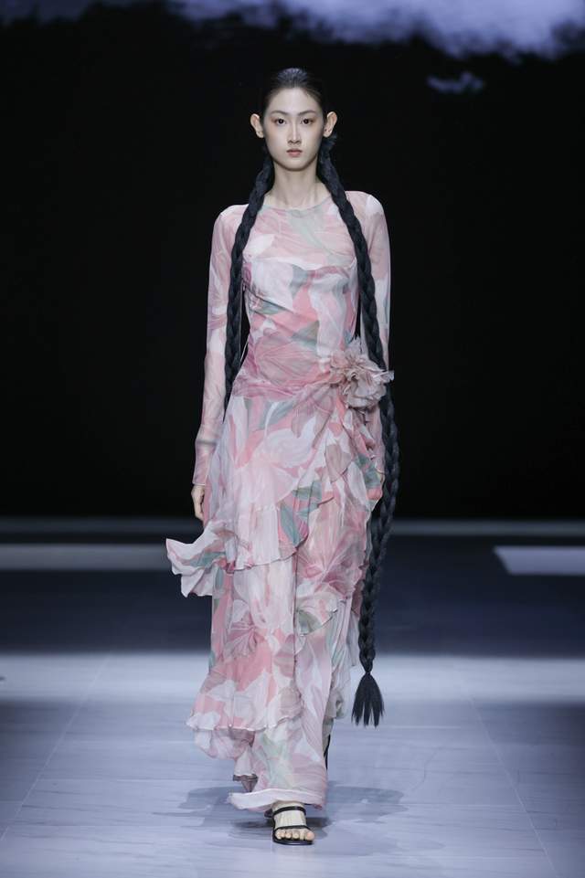 设计师采用斜裁与细密压褶并用,形成流动垂坠与行走褶影,以手工撕条与羽化生边,营造“藻羽/花序”般层层坠片,以卷边、窄包条及法式包缝处理,极好地保证了轻薄面料的整洁与强度。
