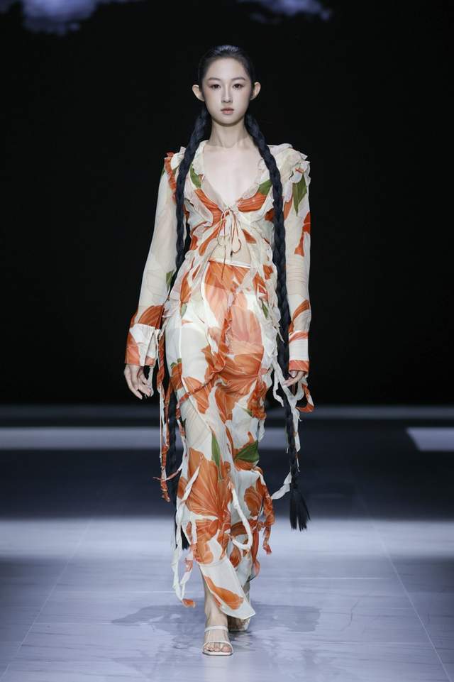 作品将浪漫自然主义与先锋解构风格交融碰撞,以柔与硬、繁与简的巧妙并置释放独特设计张力;色彩表达上,既以象牙白、雾石灰奠定温润基底,又借花序印花的灵动与烟灰晕染的朦胧作为点缀,让整体视觉兼具质感与层次。