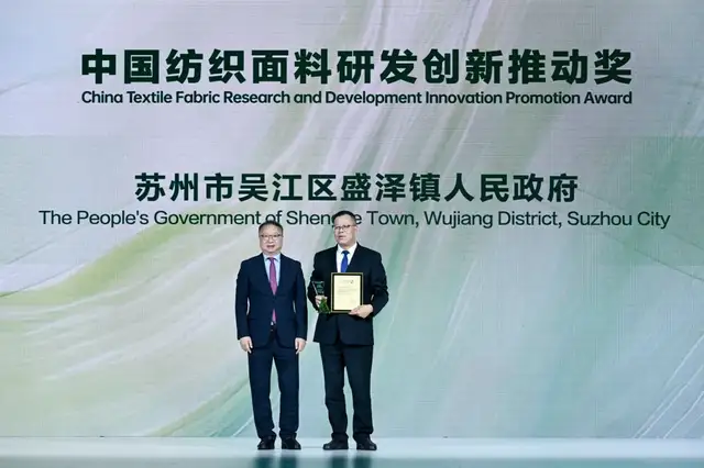 自2015年起,中国生态环保面料设计大赛与盛泽结下深厚缘分,八届并肩同行,不仅为纺织行业绿色转型搭建了专业平台,更以实际行动迈出了产业可持续发展的升级步伐。大赛授予盛泽镇人民政府“中国纺织面料研发创新推动奖”